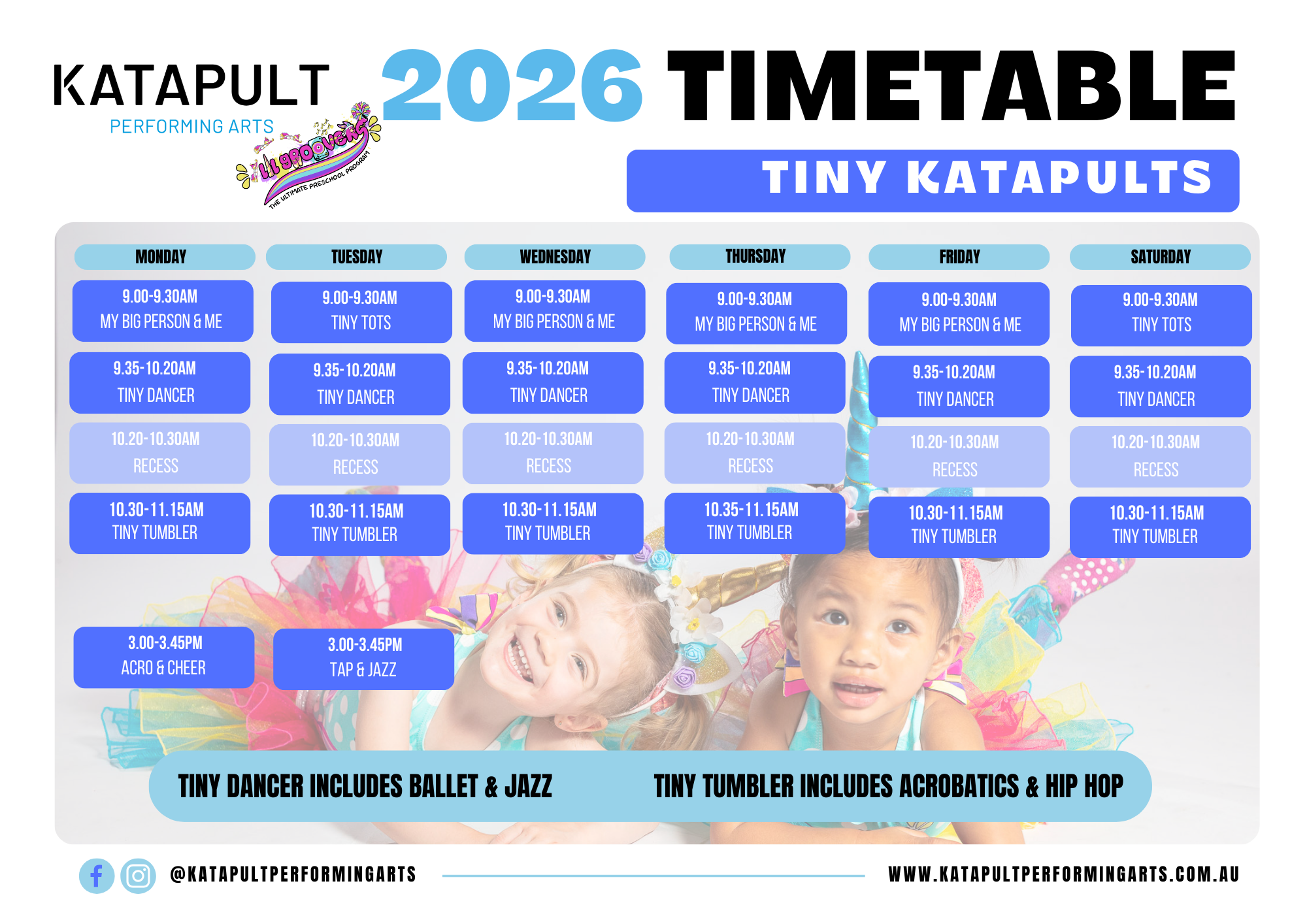 This program combines our Tiny Dancer and Tiny Tumbler classes, giving dancers exposure to ballet, jazz, acrobatics, and hip hop in one structured morning. Children also enjoy a shared morning tea break, helping them learn independence, self care, and social connection.
